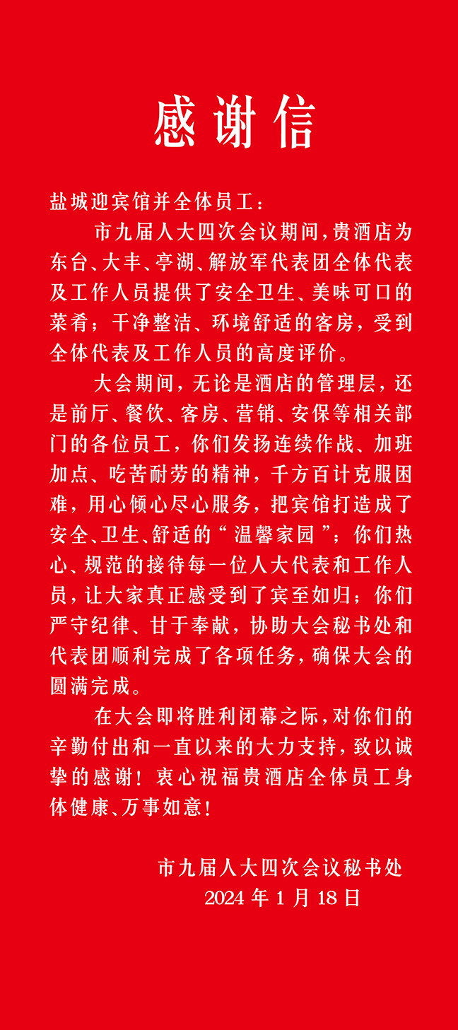 1月18日下午,市九届人大四次会议在圆满完成各项议程后胜利闭幕。作为此次大会的主要服务保障单位之一,盐城迎宾馆以高度的政治责任感、良好的工作作风和饱满的精神状态,高质量完成了各项工作任务。