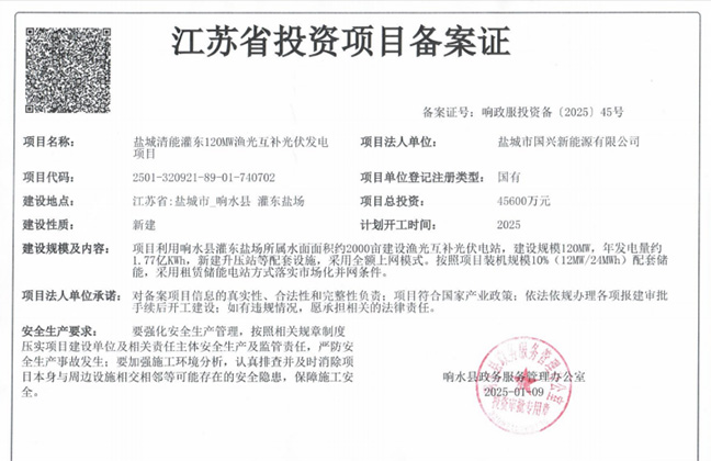 国能公司持续优化市场布局,聚焦业务拓展,积极整合资源,紧盯优质项目,利用滨海县八滩镇330亩坑塘水面建设渔光互补光伏电站,规划装机容量18MWp;与灌东盐场公司合作,利用响水灌东盐场约2000亩坑塘水面,开发建设120MW渔光互补光伏电站。目前2个项目已取得投资备案证,进入省发改委光伏发电项目实施库,正在积极推进项目前期各项工作,预计今年年底开工建设。
