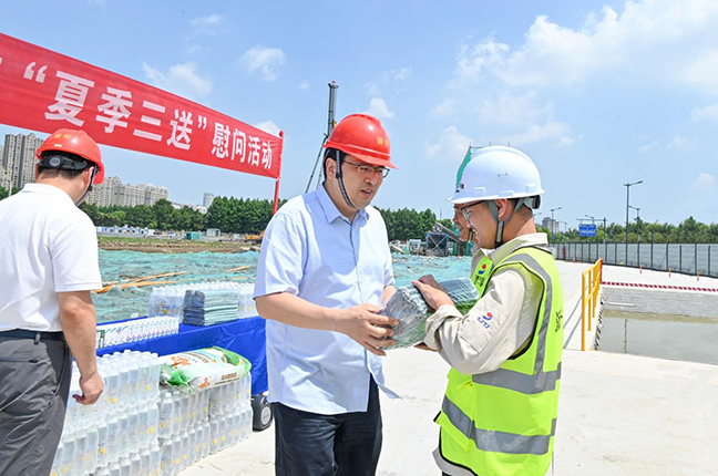 在大数据交通指挥中心项目现场,张林海与奋战在高温一线的施工人员亲切交谈,关切询问防暑降温、日常工作等情况,对他们不畏高温、坚守岗位的精神给予充分肯定,并将防暑物资一一送到他们手中,叮嘱大家在工作中要做好自我防护、注意劳逸结合、保证自身安全。