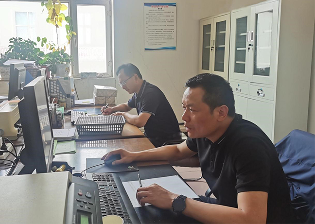吴桂高(右)现场调阅材料