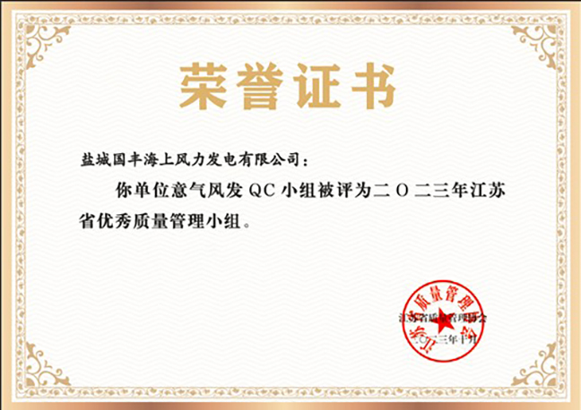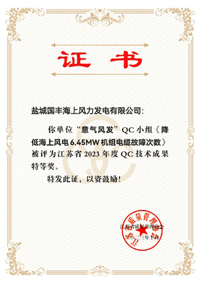 日前,从江苏省质量管理协会传来喜讯,盐城国丰公司《降低海上风电6.45MW 机组电缆故障次数》质量管理成果荣获江苏省2023年度QC技术成果特等奖,同时,公司QC小组被评为2023年江苏省优秀质量管理小组。