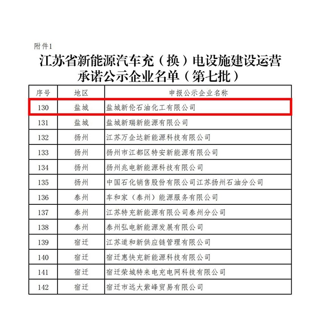 日前,省工信厅发布了《江苏省新能源汽车充(换)电设施建设运营承诺公示企业(第七批)名单》,盐城新伦石化公司榜上有名,正式纳入我省电动汽车充电设施运营服务商目录。