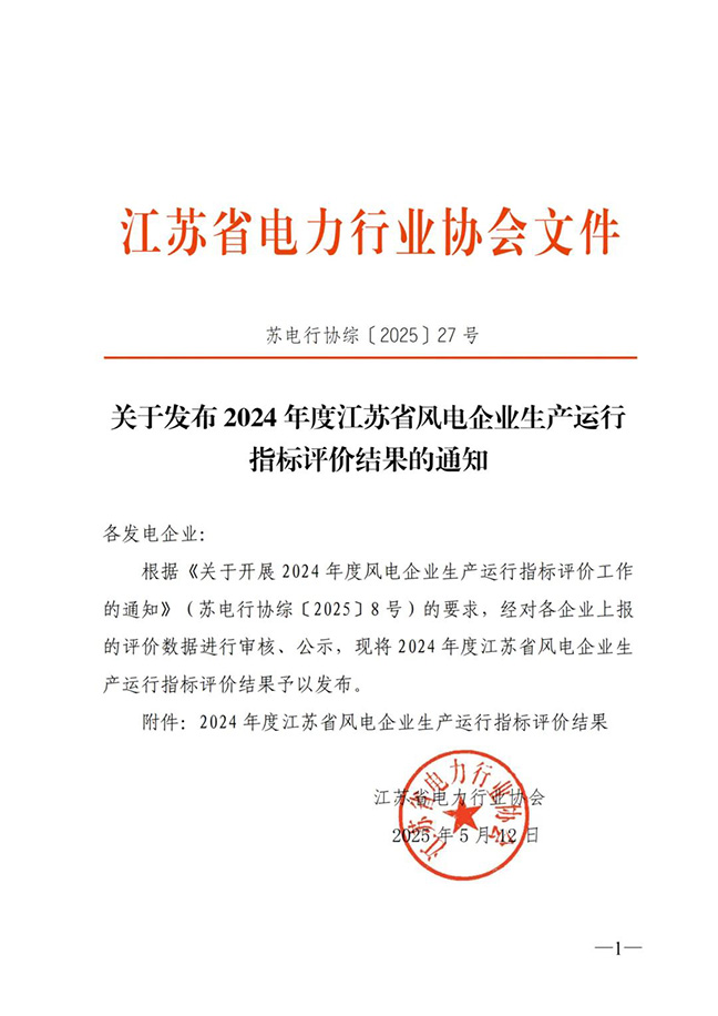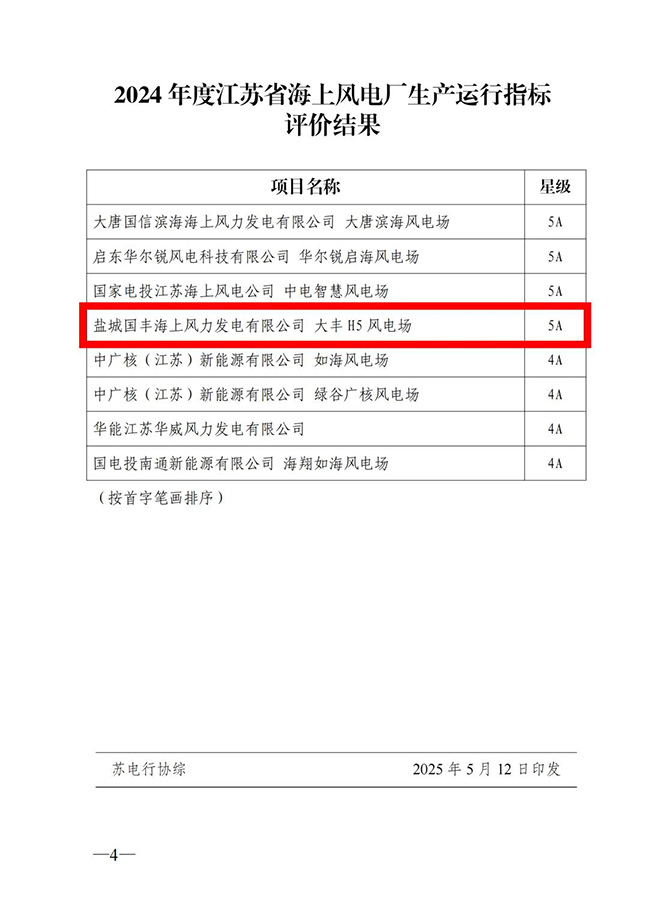 能力和高度协同的团队协作精神,获评“江苏省AAAAA级海上风电场〞称号。