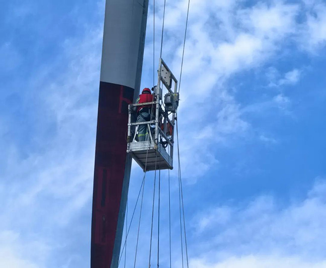 风机平台上,运维团队目光紧锁监控屏幕和现场环境。他们与高空人员时刻保持联络,凭借紧密的配合、丰富的经验和对设备的精准操控,全力应对海风影响,稳住作业平台,确保高空作业的安全,齐心协力为 “叶片飞人” 保驾护航。