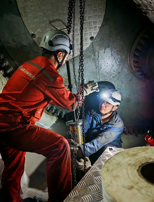 液压变桨油缸是风机调向系统的核心部件,一旦失效轻则导致机组停机,重则在台风来袭时容易引发严重设备事故。现场高空作业空间狭窄,叠加夜间低温与阵风干扰,施工难度极大。维修团队轮流作战、紧密配合,凭借精湛技艺,高效完成油管对接与系统调试,全程严格把控参数,确保安装精准可靠,从根源上杜绝安全隐患。
