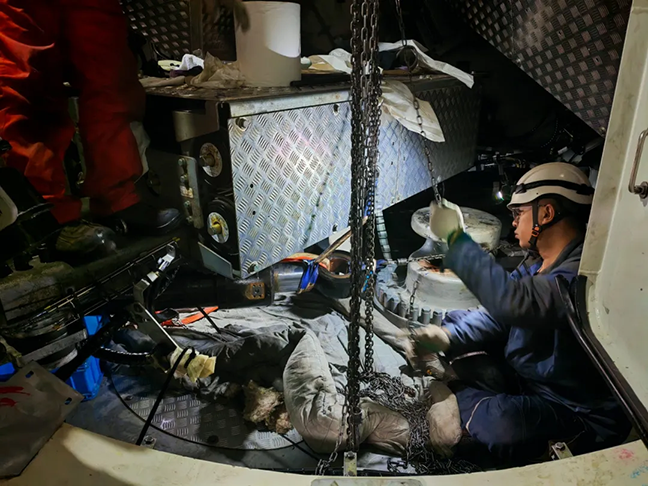 本次抢修工作任务繁杂,涵盖油缸及辅助设备吊运、滑轨支架安装、油缸拆卸更换、系统调试等多个关键工序,按常规流程需5天才能完成。面对台风逼近的紧迫压力,维修团队以“保安全、抢工期”为核心,迅速优化施工方案,科学调配人力物力,强化各工序衔接协作,成功将抢修周期大幅压缩至26小时,在台风来临前顺利完成全部抢修任务。