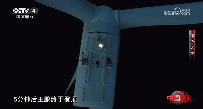 傍晚,风电场的运维人员王鹏要对15号风机进行检修,马诺打算一同前往。这座风机出水高度约120米,相当于40层楼高,为了保证上机人员的安全,他们必须要穿戴好特制的防护装置。要想进入风机内舱,马诺和王鹏要先爬到风机外部10米高的平台上,由于上风机的难度很大,程序繁琐,王鹏每次都会提前准备好所有的物资,用绳子吊上去。