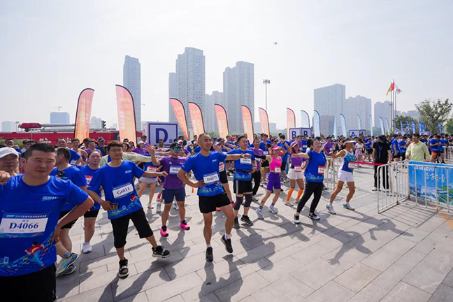 早上8点,盐城国贸中心(先锋中心)广场已人声鼎沸。参赛选手们陆续从四面八方齐聚于此,大家身着统一蓝色赛事T恤,跟随暖场音乐进行热身,现场化成欢乐的蓝色海洋。“报名参加垂直登高赛后我一直在家里练习爬楼梯,虽然是第一次参加城市级垂直登高赛,但运动都是相通的,我一定能取得好名次。”喜欢跑马拉松的成先生信心十足。
